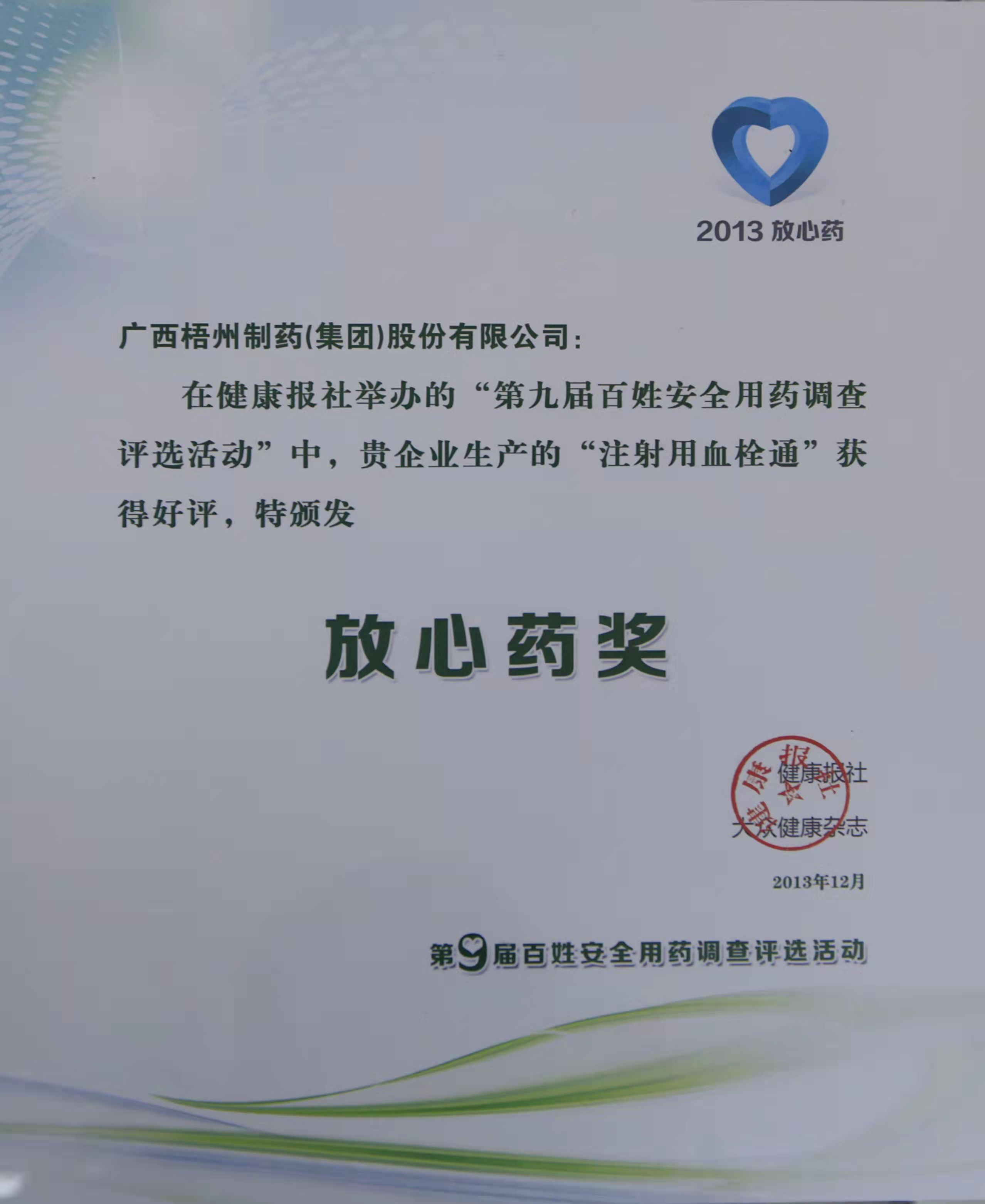 注射用血栓通榮獲第九屆百姓安全用藥調(diào)查評(píng)選活動(dòng)“放心藥”獎(jiǎng)