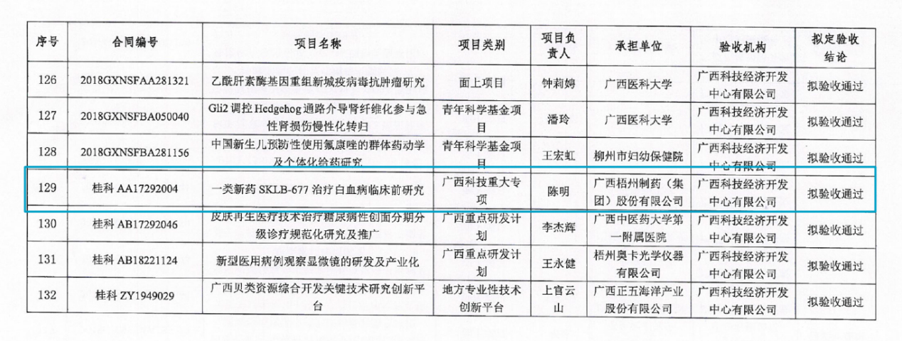 根據(jù)廣西科技項(xiàng)目評(píng)估中心發(fā)布的“廣西科技計(jì)劃項(xiàng)目擬定驗(yàn)收結(jié)論公示”(公示期:2022年7月22日—28日),中恒集團(tuán)梧州制藥承擔(dān)的廣西科技重大專項(xiàng)《一類新藥SKLB677治療白血病的臨床前研究》項(xiàng)目通過驗(yàn)收。