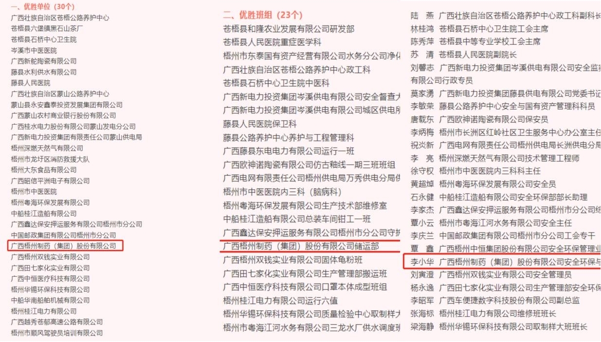 近日,梧州市“安康杯”競賽組委會辦公室通報2022年度梧州市“安康杯”競賽活動先進集體和優(yōu)秀個人,梧州制藥榮獲先進集體榮譽稱號,公司儲運部榮獲優(yōu)勝班組,原料藥車間安全環(huán)保與設(shè)備主管李小華榮獲優(yōu)秀個人稱號。
