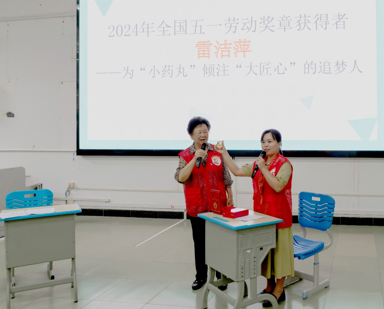 “同學(xué)們,這個(gè)是我們小雷師傅今年得到的全國(guó)五一勞動(dòng)獎(jiǎng)?wù)拢趺礃??想要嗎?”老干部局的曾憲真主任拿起金燦燦的獎(jiǎng)牌,展示給現(xiàn)場(chǎng)的同學(xué)們?!啊镔惱住?!看起來好有含金量”“雷姐姐太贊了,是我們學(xué)習(xí)的好榜樣”同學(xué)們的贊美崇拜之情溢于言表。