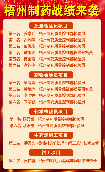 3金1銀3銅,梧州制藥45名職工在2024年梧州市職工職業(yè)技能大賽中秀絕活、展風(fēng)采、創(chuàng)佳績。在角逐中藥炮制工、質(zhì)量改進員、藥物檢驗員、化學(xué)檢驗員、維修電工、焊工、鉗工等7個項目比賽中創(chuàng)下歷史最佳成績。