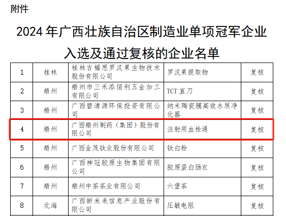 近日,廣西壯族自治區(qū)工業(yè)和信息化廳公布2024年廣西壯族自治區(qū)制造業(yè)單項冠軍企業(yè)名單,梧州制藥憑借著冠軍產(chǎn)品注射用血栓通卓越的技術(shù)能力和市場競爭力,順利通過了每三年一次的復核評價。