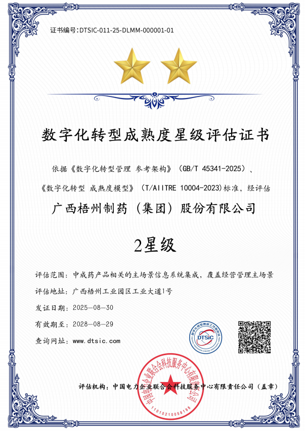 近日,數(shù)字化轉(zhuǎn)型貫標(biāo)工作委員會(huì)公布第十九批數(shù)字化轉(zhuǎn)型貫標(biāo)星級(jí)評(píng)估結(jié)果,廣西梧州制藥(集團(tuán))股份有限公司憑借扎實(shí)的轉(zhuǎn)型實(shí)踐與顯著成效,成功獲評(píng)數(shù)字化轉(zhuǎn)型成熟度2星級(jí)認(rèn)證,成為中醫(yī)藥行業(yè)數(shù)字化轉(zhuǎn)型進(jìn)程中的優(yōu)秀代表。該榮譽(yù)不僅是對(duì)企業(yè)過(guò)往轉(zhuǎn)型工作的權(quán)威認(rèn)可,更為行業(yè)同仁推進(jìn)數(shù)字化轉(zhuǎn)型提供了可參考的實(shí)踐路徑。